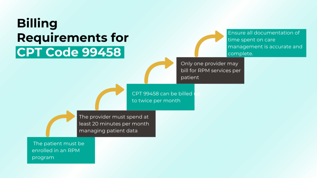 Providers can bill CPT 99458 up to twice per month, which means they can receive reimbursement for up to 60 minutes of care for each patient per month. This is ideal for patients who require ongoing monitoring and adjustment of their care plan.