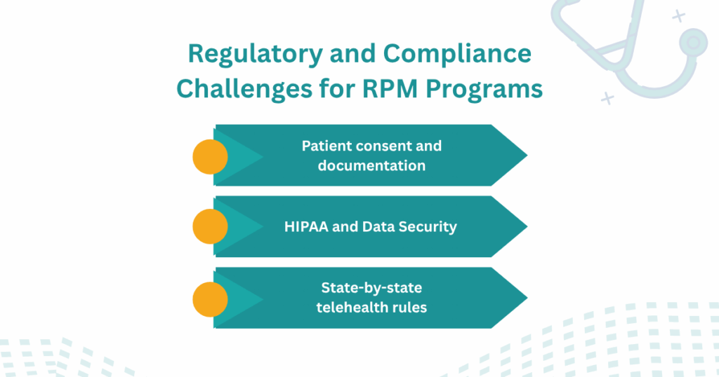 - HIPAA and data security: RPM systems must comply with HIPAA standards across data transmission, storage, and access. This applies to every device, platform, and third-party vendor involved in care delivery.