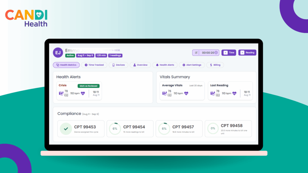 Tip: Clearly separate time entries for 99457 and 99458 to avoid double-counting. CandiHealth’s time tracking tools help you log each block separately so you never miss a reimbursement opportunity.
