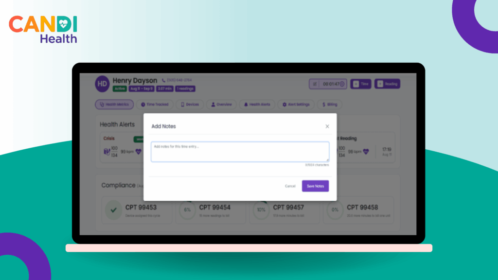 Tip: The 16-day rule does not apply — but you must show at least 20 minutes of documented time. CandiHealth automatically tracks time spent on patient care and also allows doctors to add notes, making 99457 billing audit-ready.